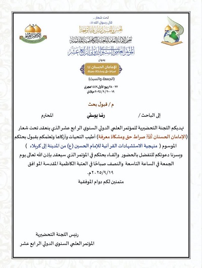 تبریک ویژه به جناب آقای رضا یوسفی بابت پذیرش مقاله ایشان در المؤتمر العلمی السنوی الدولی الرابع عشر للعتبة الکاظمیة با موضوع: